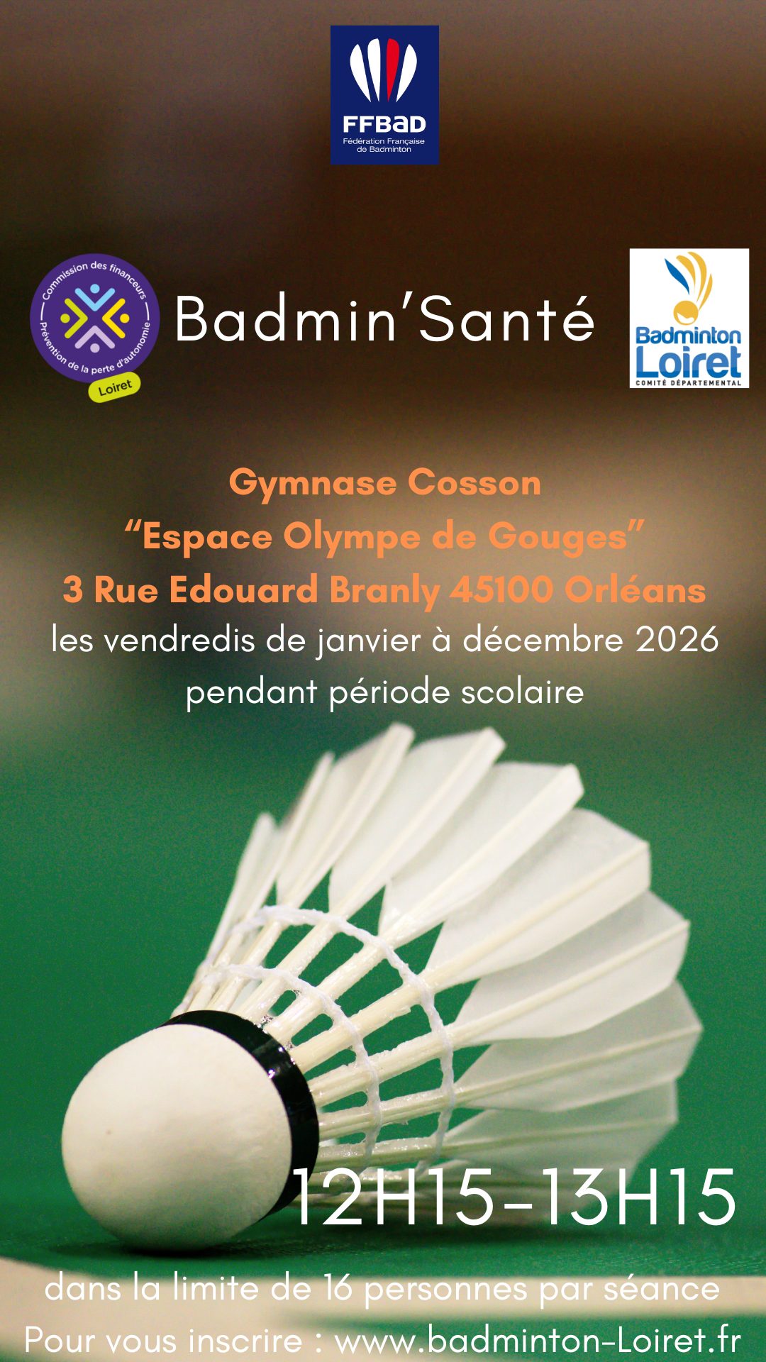 Cette activité s’adresse à toutes les populations, adhérentes ou non* à un club du Loiret, voulant s’initier/s’améliorer au badminton, dans la limite de 16 personnes par séance.